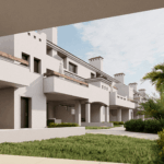 The new development in Los Alcázares is characterised by its Mediterranean-style exterior design that blends in perfectly with the natural surroundings of the region. The ground floor flats have private gardens, surrounded by high walls that guarantee privacy, while the penthouses have spacious terraces offering panoramic views. Residents can enjoy the communal swimming pool and garden areas, which are landscaped with natural vegetation, providing a relaxing and welcoming atmosphere. A large masonry wall, distinctive of the construction company, adds a warm contrast between the white of the facades and the earthy colours, creating visual harmony and a sense of hierarchy. The proximity to the prestigious golf course "La Serena Golf" and only 1100 metres from the beach, make this location an ideal place to enjoy the Mediterranean climate and various outdoor activities.