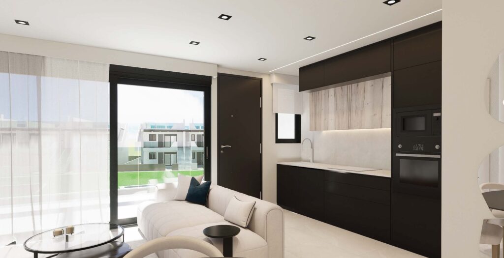 The exteriors of these bungalows are designed to maximize enjoyment of the Mediterranean climate. Each property features a private garden, perfect for creating a personal green space or enjoying outdoor moments. Additionally, the terraces offer an ideal place to relax or share with friends and family. For those seeking panoramic views, the high-bungalows include a solarium, providing additional space for leisure and relaxation. The proximity to the sea adds special value, allowing enjoyment of the sea breeze and beach walks just one kilometer away.