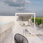 The exteriors of these bungalows are designed to make the most of the Mediterranean climate. Each property features a private garden, perfect for enjoying outdoor moments in an intimate and natural setting. The presence of a terrace offers additional leisure space, ideal for outdoor dining or simply relaxing while enjoying the sea views. Additionally, the bungalows include a solarium, providing extra space for sunbathing or enjoying panoramic views. The inclusion of a private pool in each bungalow adds a touch of luxury, allowing for refreshing dips on the hottest days without leaving home.
