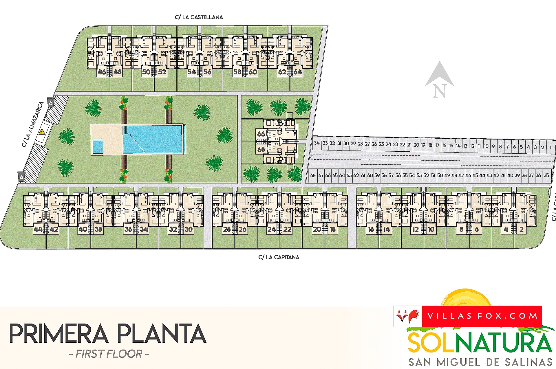 The Sol Natura Residential its placed in the town of San Miguel de Salinas,specifically in La cañada area, sorrounded by a beautiful protected pine forestamong the golf courses of Campoamor and Las Colinas, and only 5km away from thesea.Residential Sol Natura consists of two types of houses: one in the ground floorwith two bedrooms, twobathrooms, two spacious gardens and surface parking ; and other in the top floor,made of two bedrooms, twobathrooms, a large solarium and an surface parking. Properties on top floor havesea views.In line with our former developments, the properties of Sol Natura featurespacious interiors.Due to its larger dimensions we also offer the possibility to building any of theproperties with three bedrooms.The Sol Natura Residential includes a large garden with grass, coveringaproximately 1735m2 , a swimming pool with a spa and children´s area. As well asadditional gardens with palm trees and plants . All of this ,makes the residential anideal environment to enjoy thesun year-round with family.Please note that prices shown are exclusive of sales tax (in Alicante 10%, or 8% for Spanish buyers under the age of 35) and notary, registry and solicitor costs (typically 2,500-4,000 euros). If the property is a new-build (obra nueva) an additional 1.5% AJD tax is payable. All information given is a guide only. Properties can be reserved by payment of a reservation deposit, and signing of a reservation contract. Any furniture or electrical items included in the sale are sold as second-hand items without guarantee unless otherwise stated. The prices are INCLUSIVE of agent fees, ie the buyer does not pay an estate agency fee when purchasing with Villas Fox.