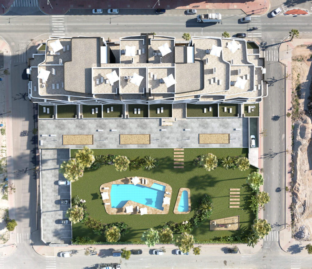 The residential complex features various common areas that enhance the living experience of its residents. The garden areas offer a natural and relaxing environment, perfect for enjoying a walk or simply resting outdoors. The communal pool is an ideal meeting point for socializing and enjoying the Mediterranean climate, while the children's playground provides a safe and fun space for kids. These facilities are designed to foster a sense of community and offer residents a comfortable and enjoyable lifestyle.