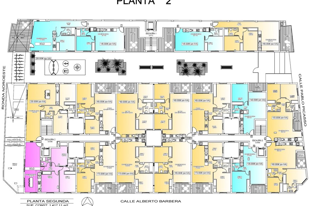 On the rooftop, residents can enjoy an exclusive 350 m² leisure area featuring a 70 m² swimming pool with a childrens splash pool, pergolas, parasols and sun loungers everything you need to unwind under the Spanish sun while taking in the panoramic views. This area is easily accessible via one of the three lifts and is equipped with the necessary sanitary facilities.