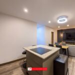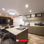 The ground floor features 3 bedrooms, 1 family shower room and 1 en-suite bathroom to the main bedroom with both a bath (with hydro-massage jets) and separate deeply-recessed shower area. There is also a reception room, and spacious lounge and kitchen area. Not only does the ultra-modern, fully-fitted kitchen with eye-level ovens feature plenty of worktops and storage space, but the centre-piece is a free-standing island incorporating a hob and breakfast bar.