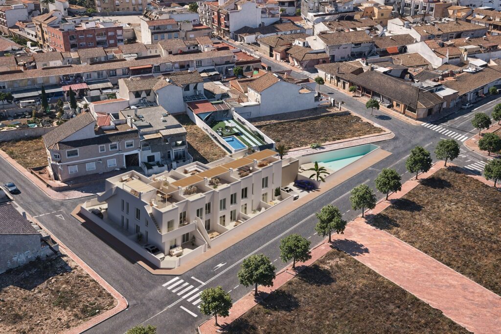 The exteriors of these homes have been carefully designed to offer maximum comfort and functionality. Each bungalow features a private pool, perfect for enjoying the sunny climate of the region. Additionally, the properties are equipped with pergolas that provide shade and additional space for outdoor leisure. The installation of electric shutters ensures privacy and comfort, while the pre-installation of air conditioning allows for maintaining a pleasant temperature at any time of the year. For sustainability enthusiasts, a charging point for electric cars has been included, facilitating eco-friendly mobility.