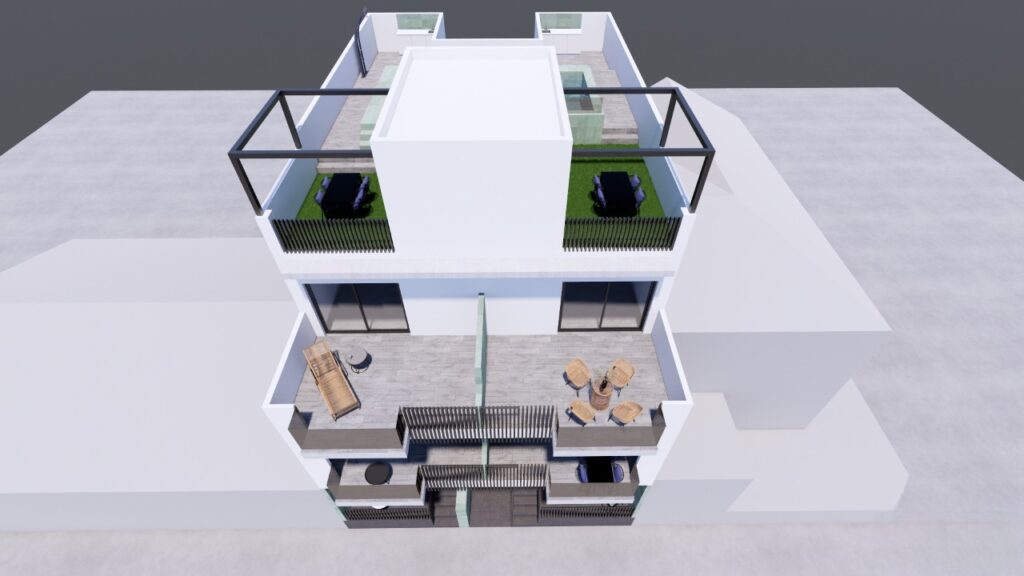 The interiors of these properties are designed with attention to detail and functionality. Each apartment and ground floor features two bedrooms and two bathrooms, offering a comfortable and well-distributed space. The tiled floors add a modern touch and are easy to maintain. Built-in wardrobes in the bedrooms provide ample storage space, while the pre-installation of air conditioning ensures the home is ready for comfort in all seasons. The layout includes a terrace, extending the living space outdoors, allowing enjoyment of the climate and views.
